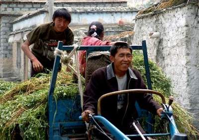 8月7日,西藏乃东县凯松居委会致富能手达瓦次仁(前)开着自家手扶拖拉机运饲料。达瓦次仁是凯松第一个养猪、种植食用菌、创办小型豆粉加工厂的人,他家每年副业收入4万多元。