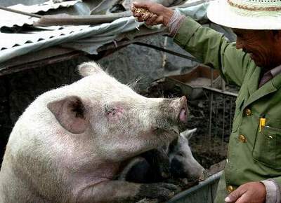 8月7日,西藏乃东县凯松居委会农民土登在喂猪。
