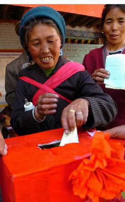 8月7日,西藏乃东县凯松居委会农民在投票选举居委会干部。