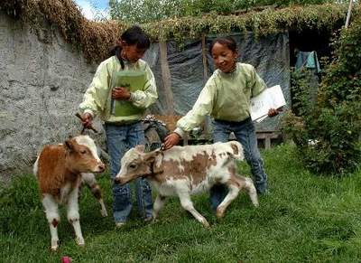 8月6日,西藏乃东县凯松居委会的孪生姐妹白玛措姆(左)和白玛次尼放学后牵着小牛犊玩耍。目前凯松居委会适龄儿童入学率达到100%。
