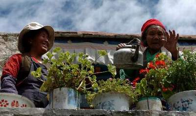 8月7日,70岁的西藏乃东县凯松居委会老阿妈仓决(右)与女儿一起浇花。仓决在旧社会是无人身自由的“朗生”(即农奴)。