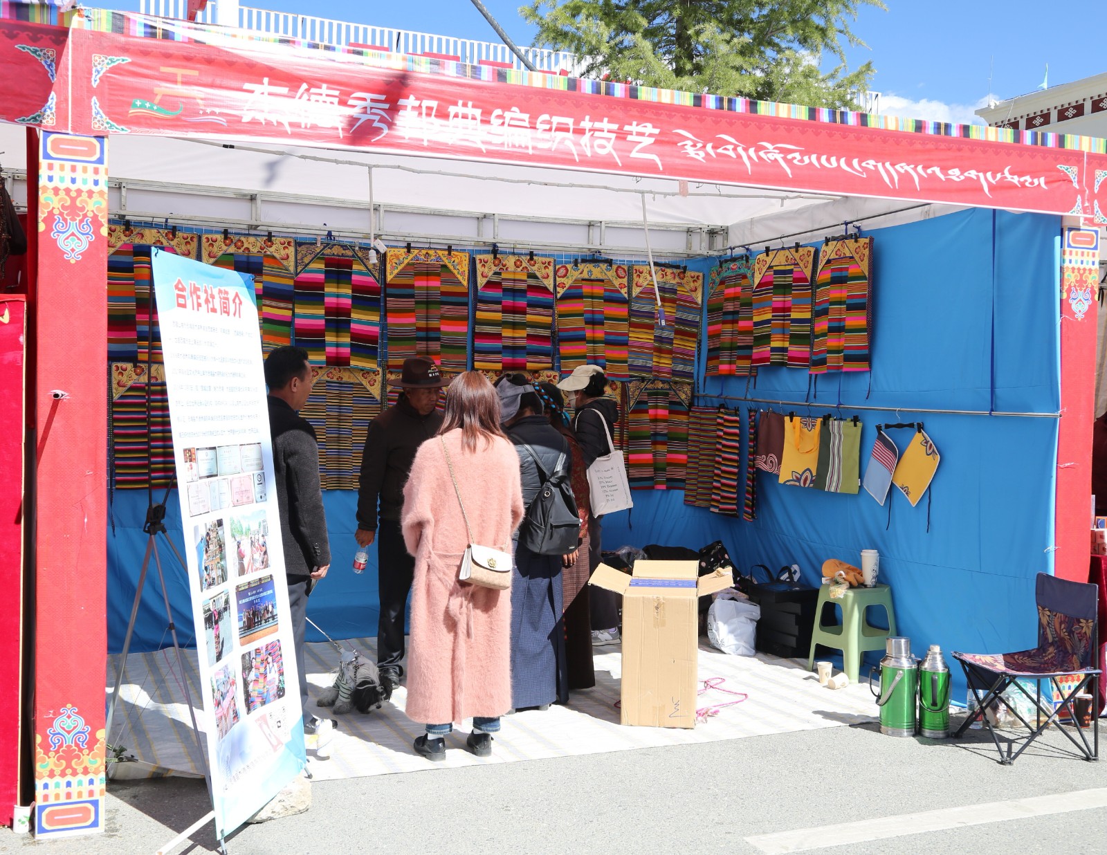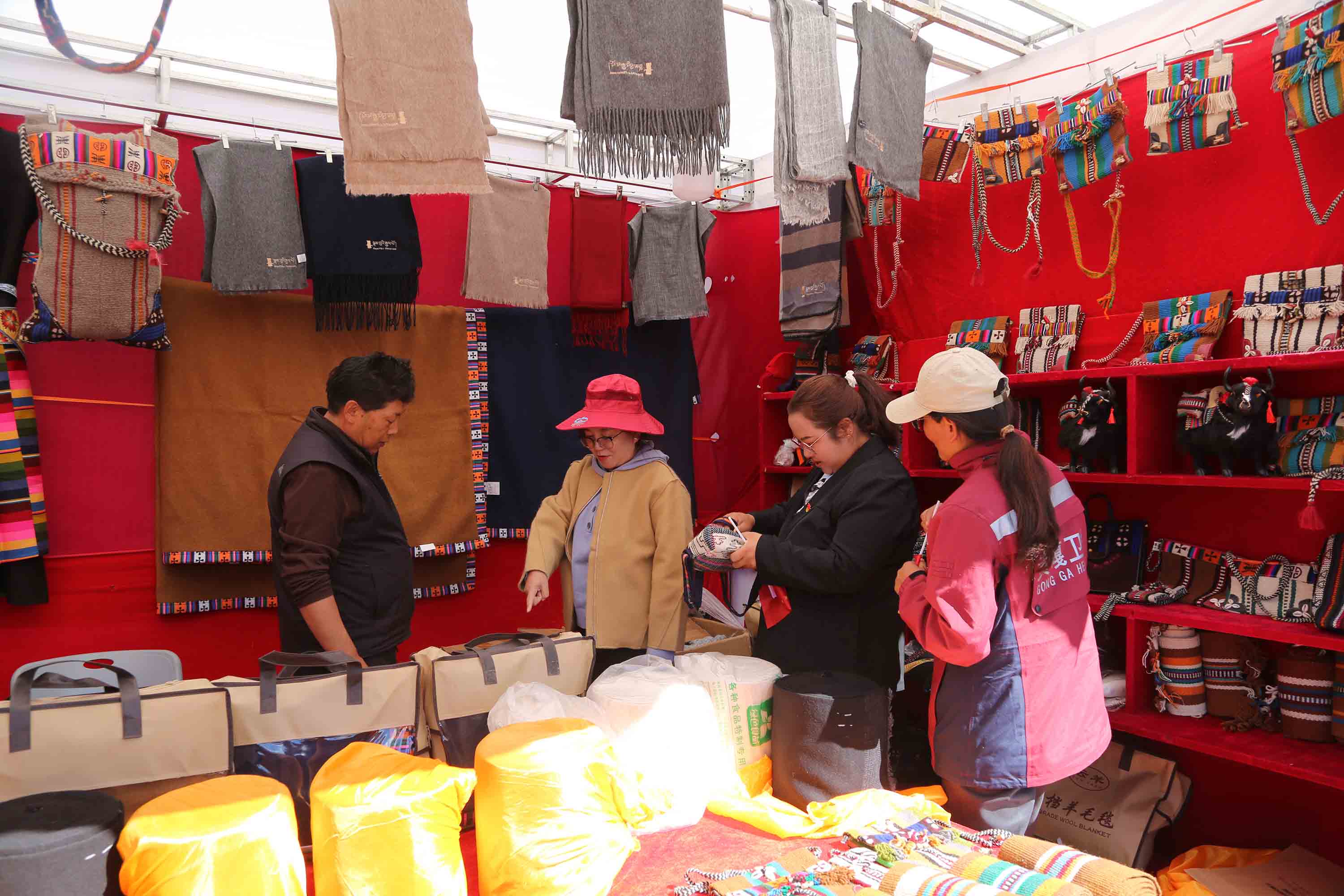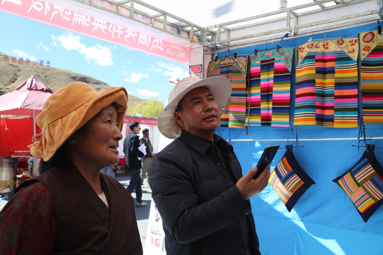 在物资文化交流会展销区,展位上摆放着琳琅满目的各类产品。不仅有邦典手工艺品、克西木雕、藏式木碗等精美的特色产品,还有奶渣、糌粑、牛羊肉等家家户户的日常用品……各类商品应有尽有,前来采购的群众络绎不绝,商家的叫卖声和群众的欢笑声充斥着整个街道。