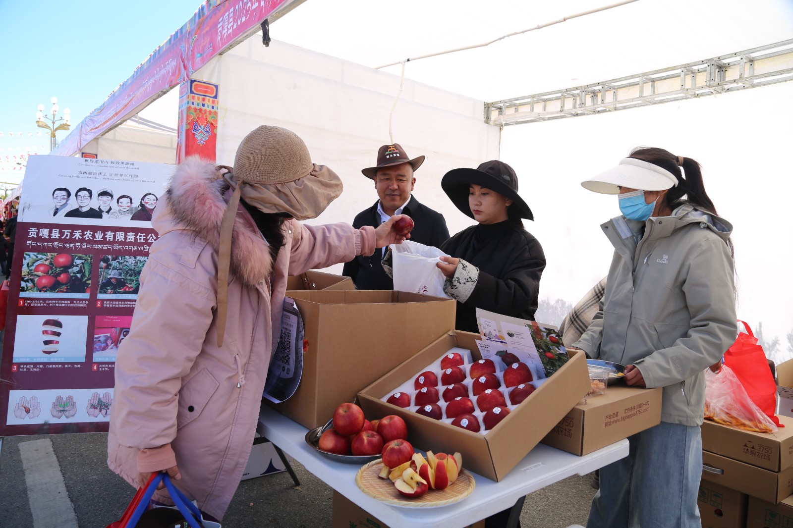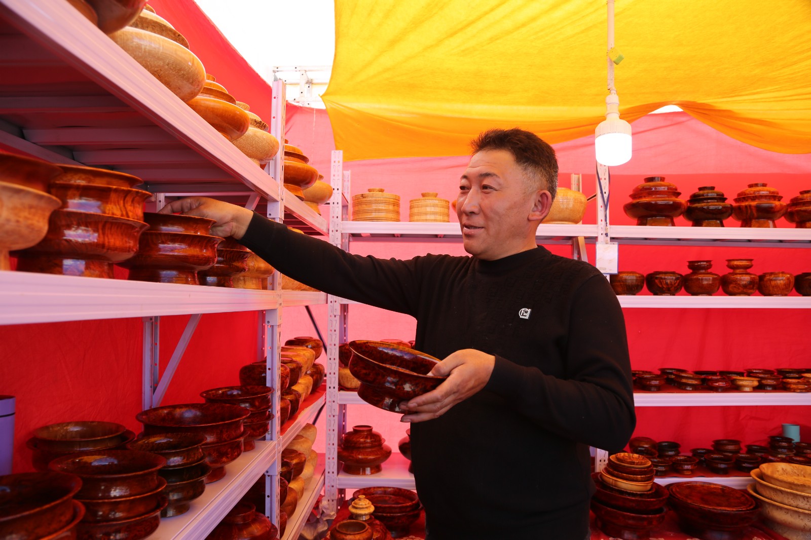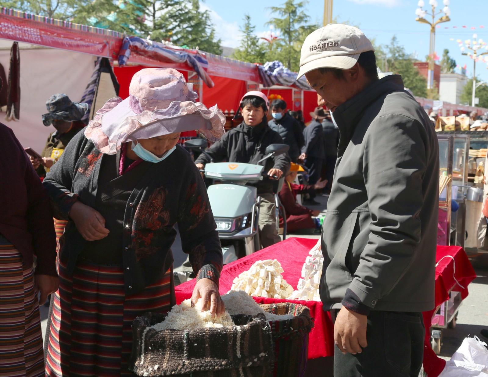 在物资文化交流会展销区,展位上摆放着琳琅满目的各类产品。不仅有邦典手工艺品、克西木雕、藏式木碗等精美的特色产品,还有奶渣、糌粑、牛羊肉等家家户户的日常用品……各类商品应有尽有,前来采购的群众络绎不绝,商家的叫卖声和群众的欢笑声充斥着整个街道。