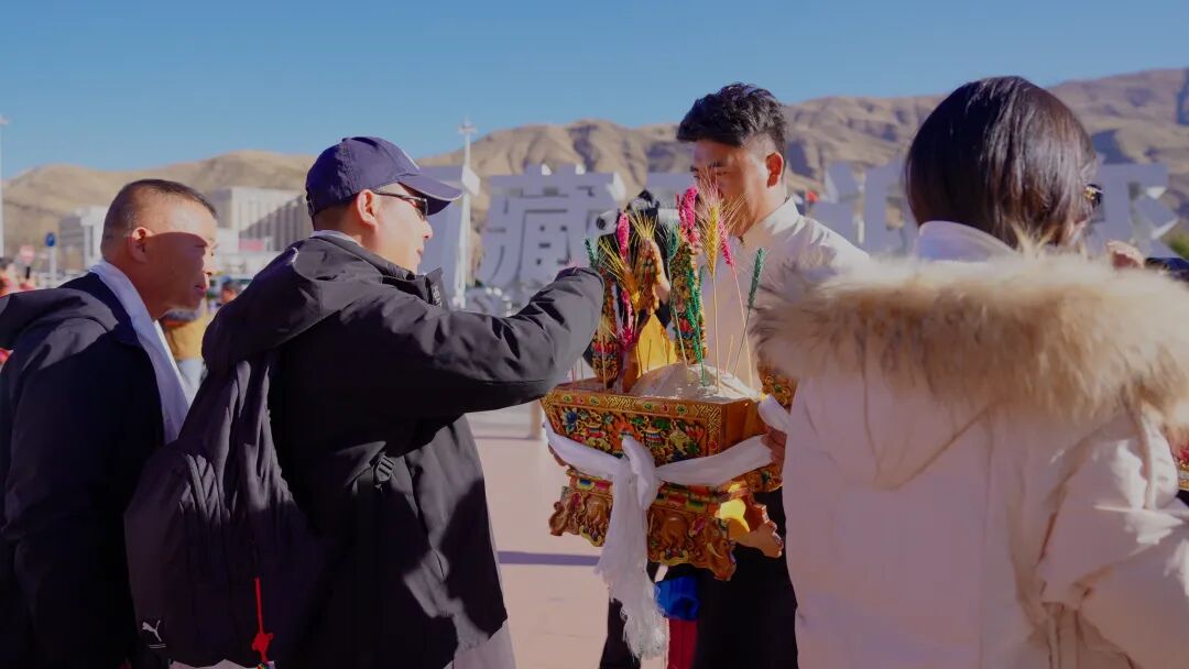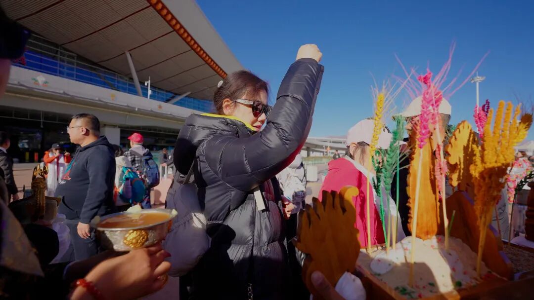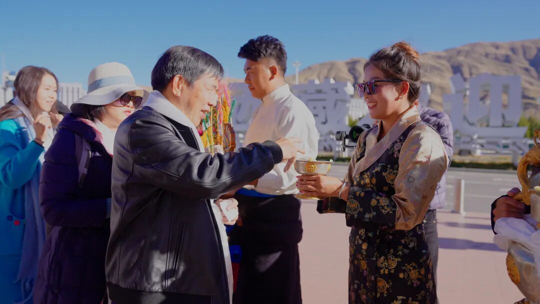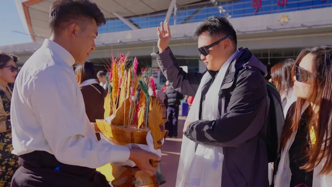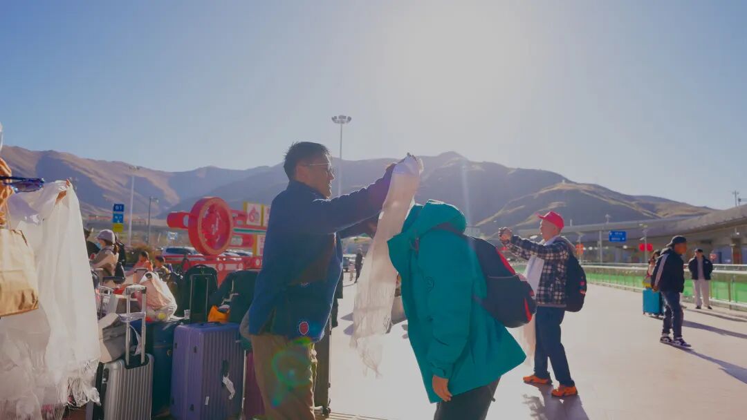 工作人员身着传统服饰,手持洁白的哈达、醇香的青稞酒和“切玛”,为刚下飞机的游客们送去山南人民的祝福。初次体验藏族迎客礼仪的游客们眼里满是好奇,纷纷询问工作人员礼仪背后的蕴意,并拿出手机记录下这温馨的时刻。体验完迎客礼仪后,游客们纷纷在贡嘎机场前的“西藏欢迎您”标志前一同合影留念,将不同地方游客同聚山南的美好一幕定格了下来。
