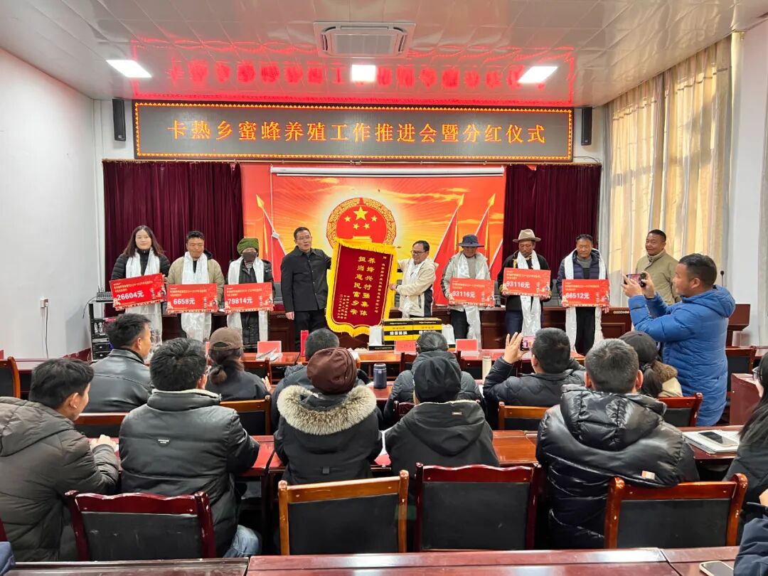经过三年深耕,卡热乡蜜蜂养殖产业成效显著。目前全乡蜜蜂存栏达550箱,2025年累计收获蜂蜜3773斤,创收12.97万余元,已连续三年分红超10万元。曾经集体经济不温不火的卡热乡,如今正凭借蜜蜂养殖这一特色产业,蹚出一条乡村振兴和集体经济壮大的宽阔大道。